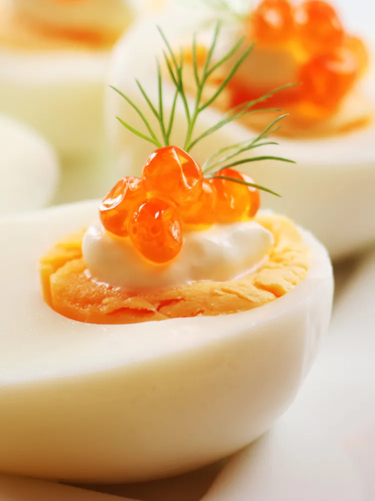 Scoop out the yolk and mash it together in a small bowl with the mayonnaise and cream until smooth. Season to taste with salt and pepper, and scoop into a piping bag with a large star nozzle.